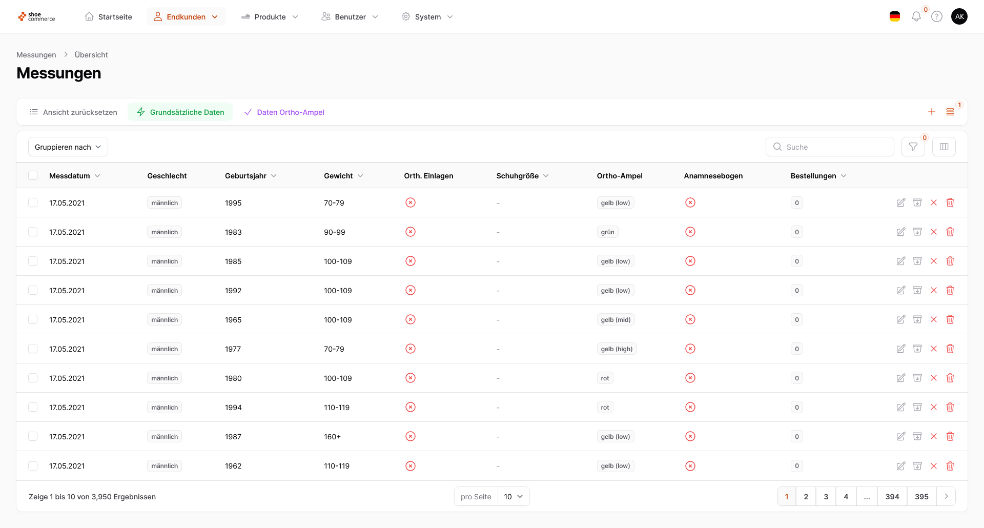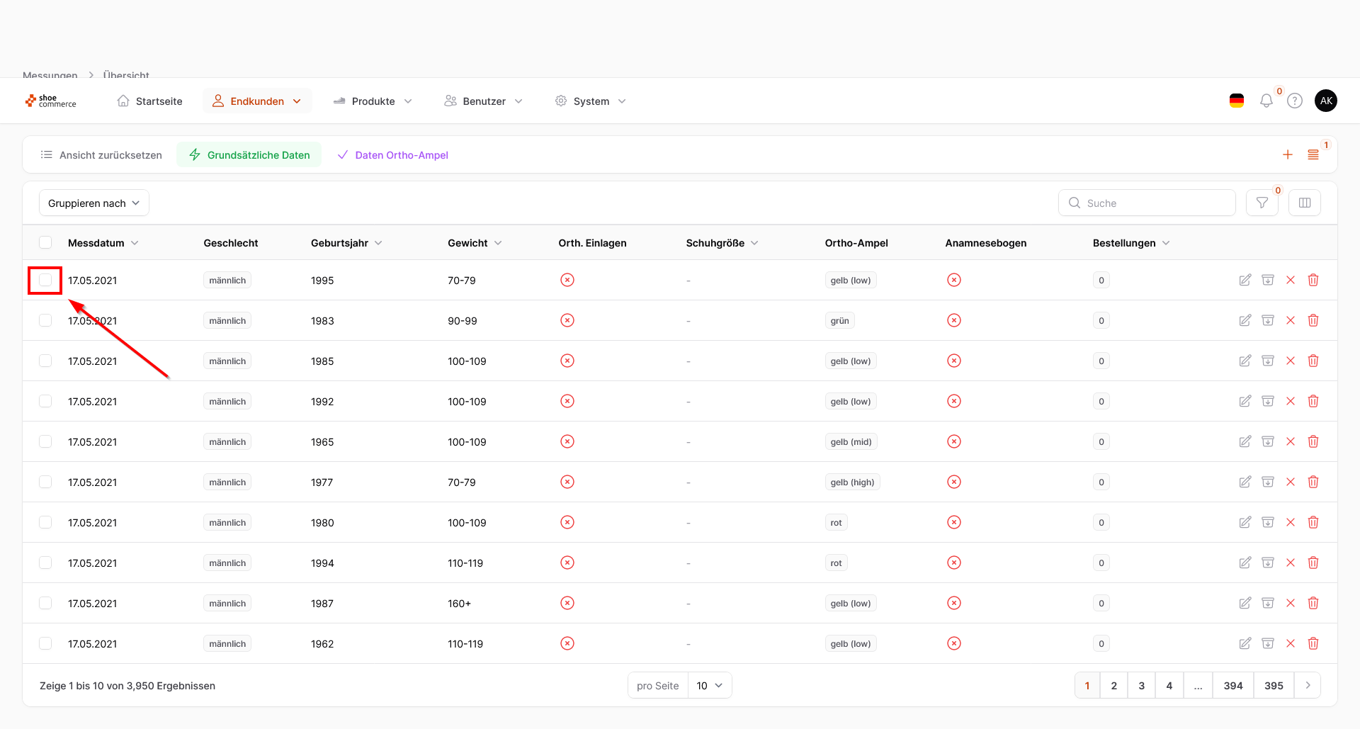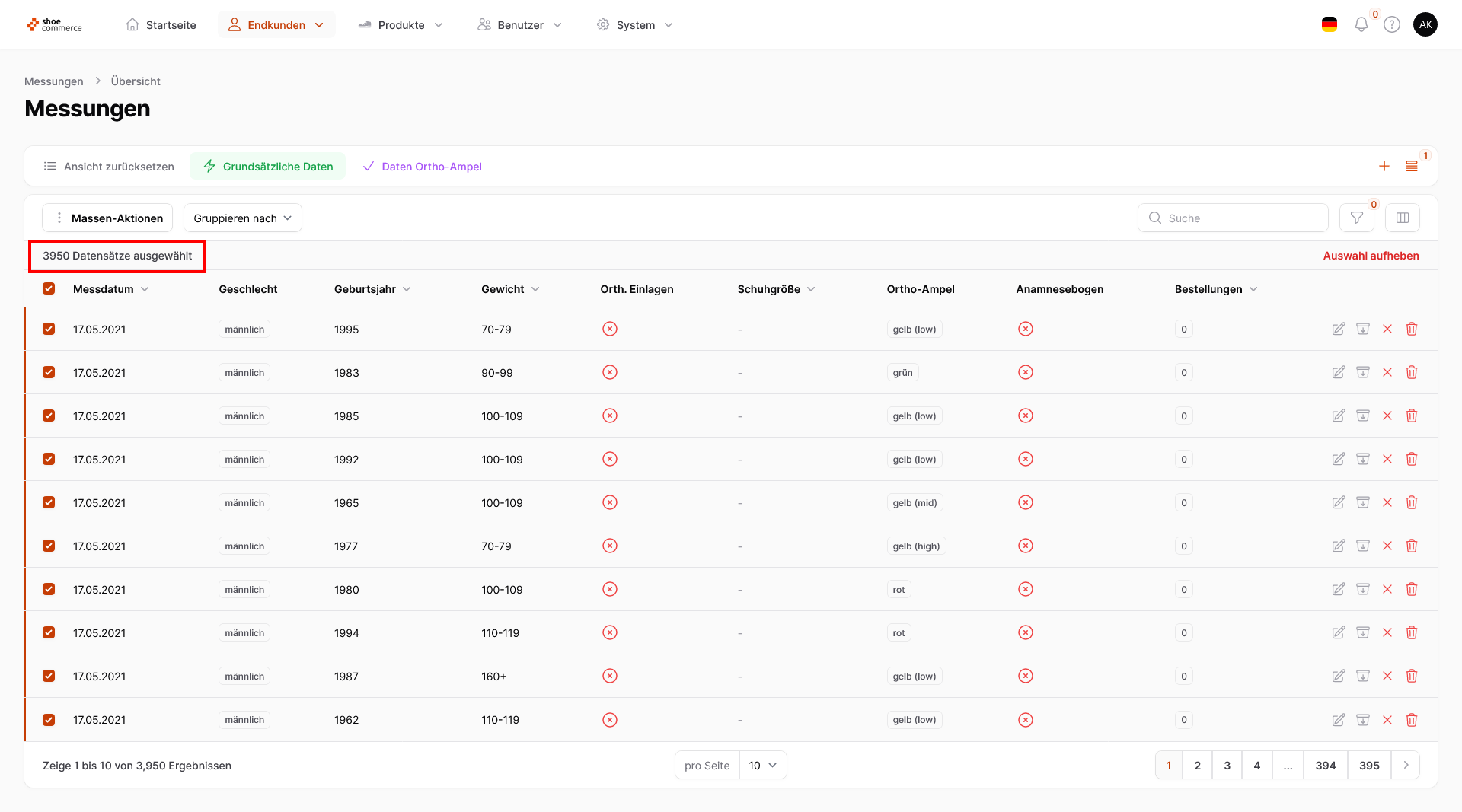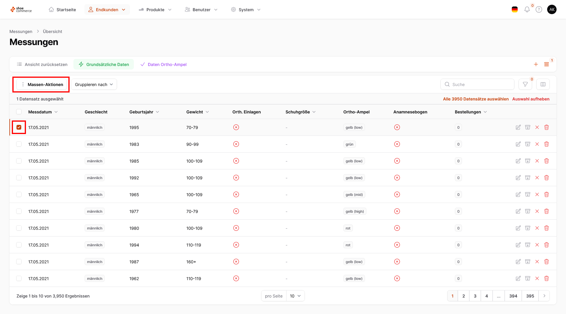- Um den kompletten Datenbestand auszuwählen, und nicht nur den sichtbaren Teil der Datensätze, ist es zunächst notwendig, mindestens einen Datensatz manuell zu markieren. Hierdurch wird oben rechts die Möglichkeit eingeblendet, den gesamten Datenbestand auszuwählen (hier im Beispiel 3.950 Datensätze). Auch nicht sichtbare Datensätze auf weiter folgenden Seiten sind somit in der Auswahl enthalten.