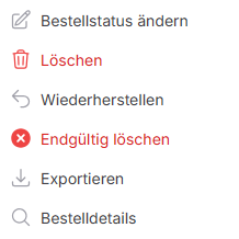 Exportieren (Excel) | Exportiert alle markierten Datensätze in eine Exceldatei. Beachten Sie bitte, dass dabei nur die Spalten exportiert werden, die im Backend auch tatsächlich angezeit werden. |
