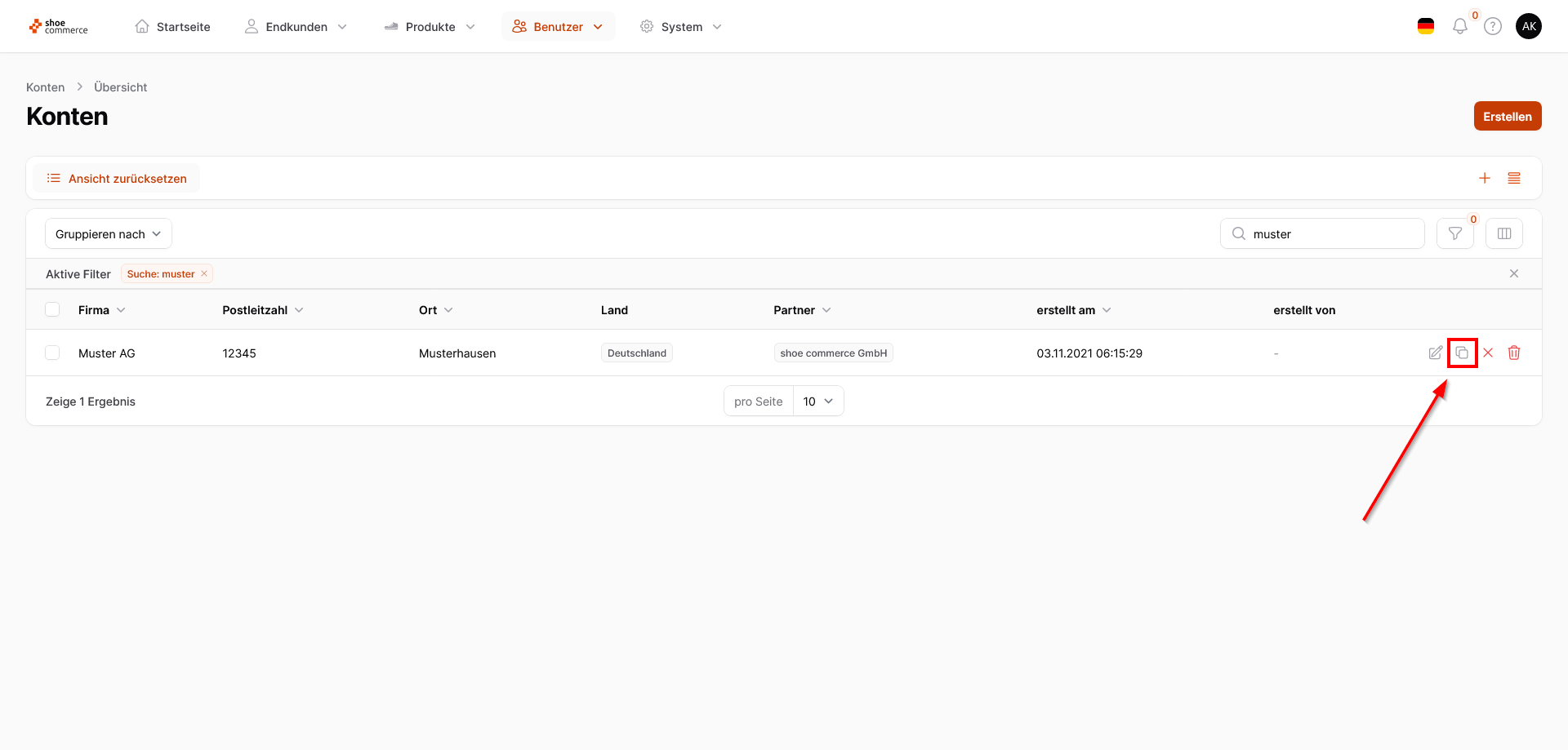- Klicken Sie zunächst auf das Symbol "Duplizieren" für das Konto, das Sie als Grundlage verwenden möchten.