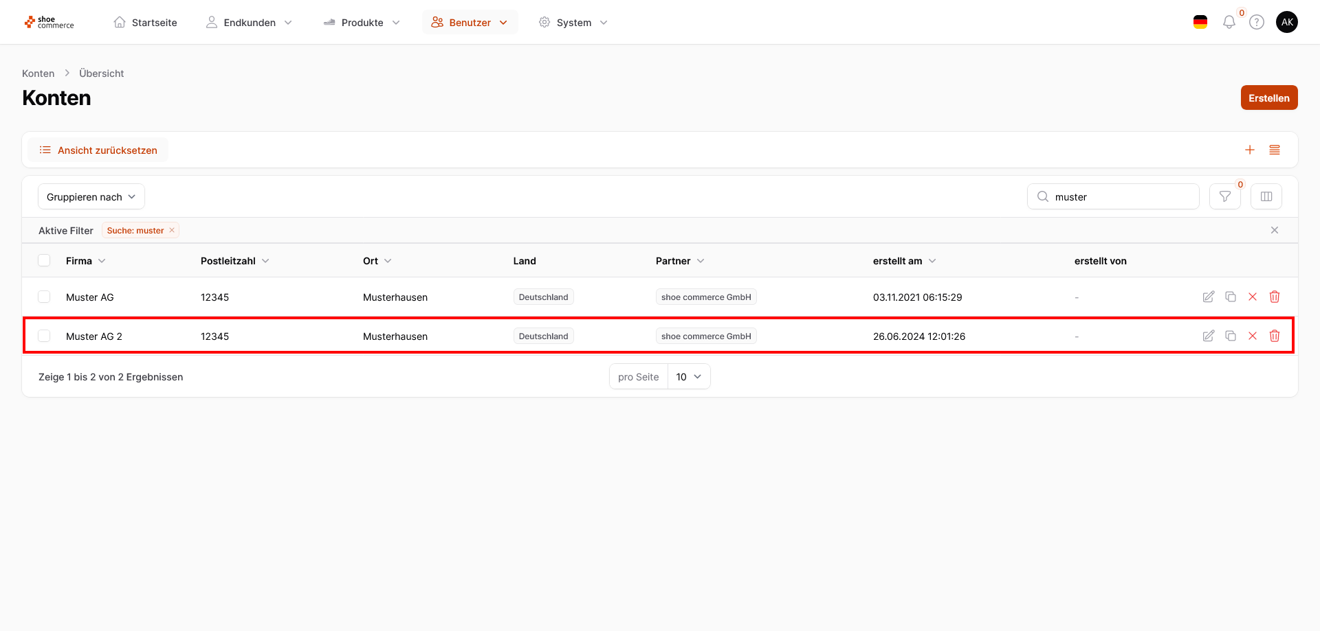 - Nun öffnet sich die Seite "Konto erstellen", bei der jedoch alle Daten des ausgewählten Kontos übernommen werden. In unserem Beispiel möchten wir alle Einstellungen übernehmen, ändern jedoch lediglich den Firmennamen auf "Muster AG 2".