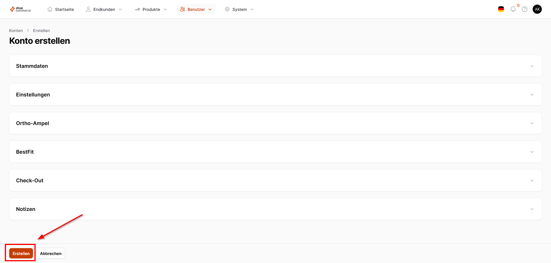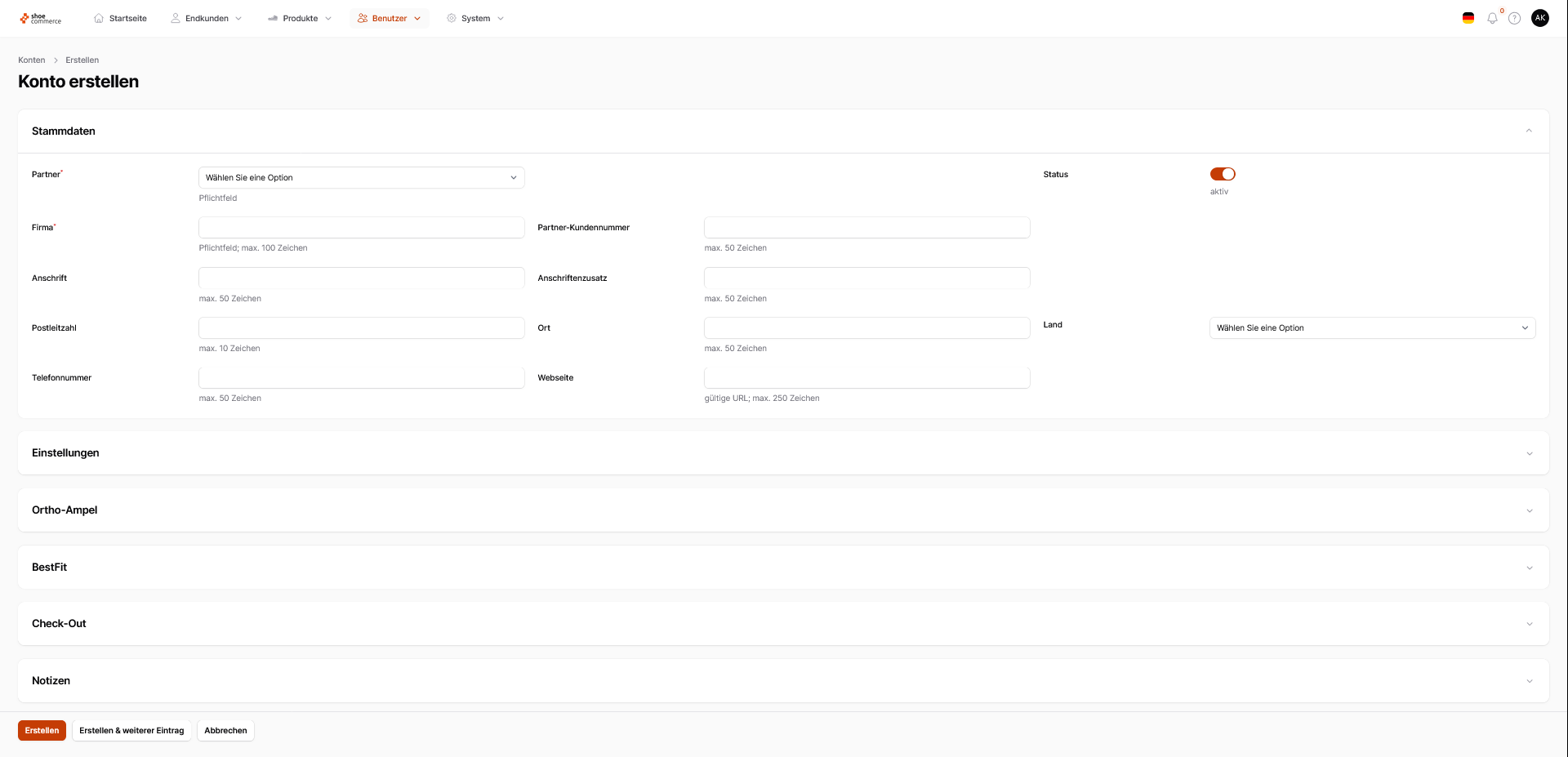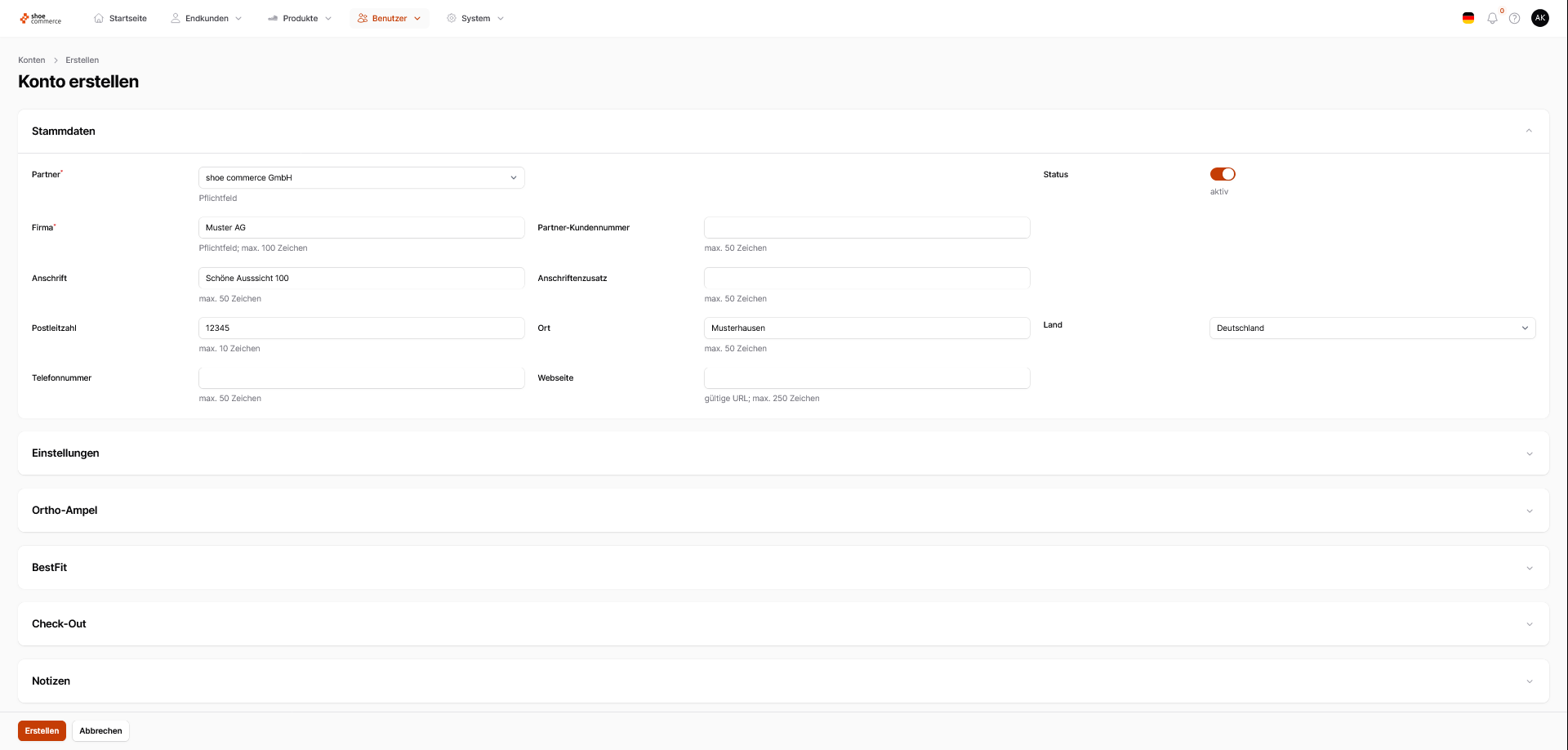 - Haben Sie alle Einträge ausgefüllt drücken Sie auf den orangenen Button "Erstellen" unten links, um das Konto final zu speichen.