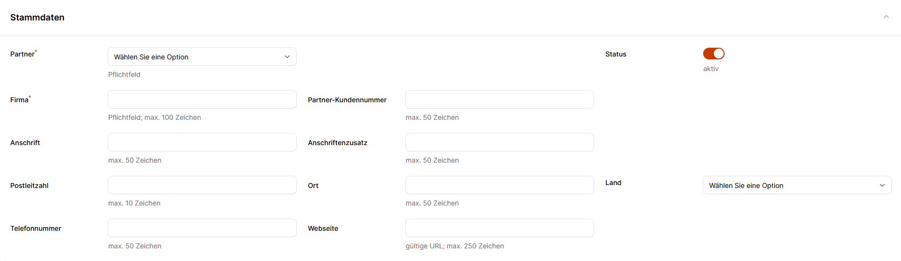Pflichfelder wie etwa "Partner" oder "Firma" werden dabei mit einem roten Stern markiert.