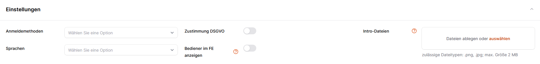 Intro-Dateien | Hier können die entsprechenden Dateien der Intro-Dateien hinterlegt werden. Zulässige Dateiformate sind .png sowie .jpg mit einer maximalen Größe von 2 MB. |