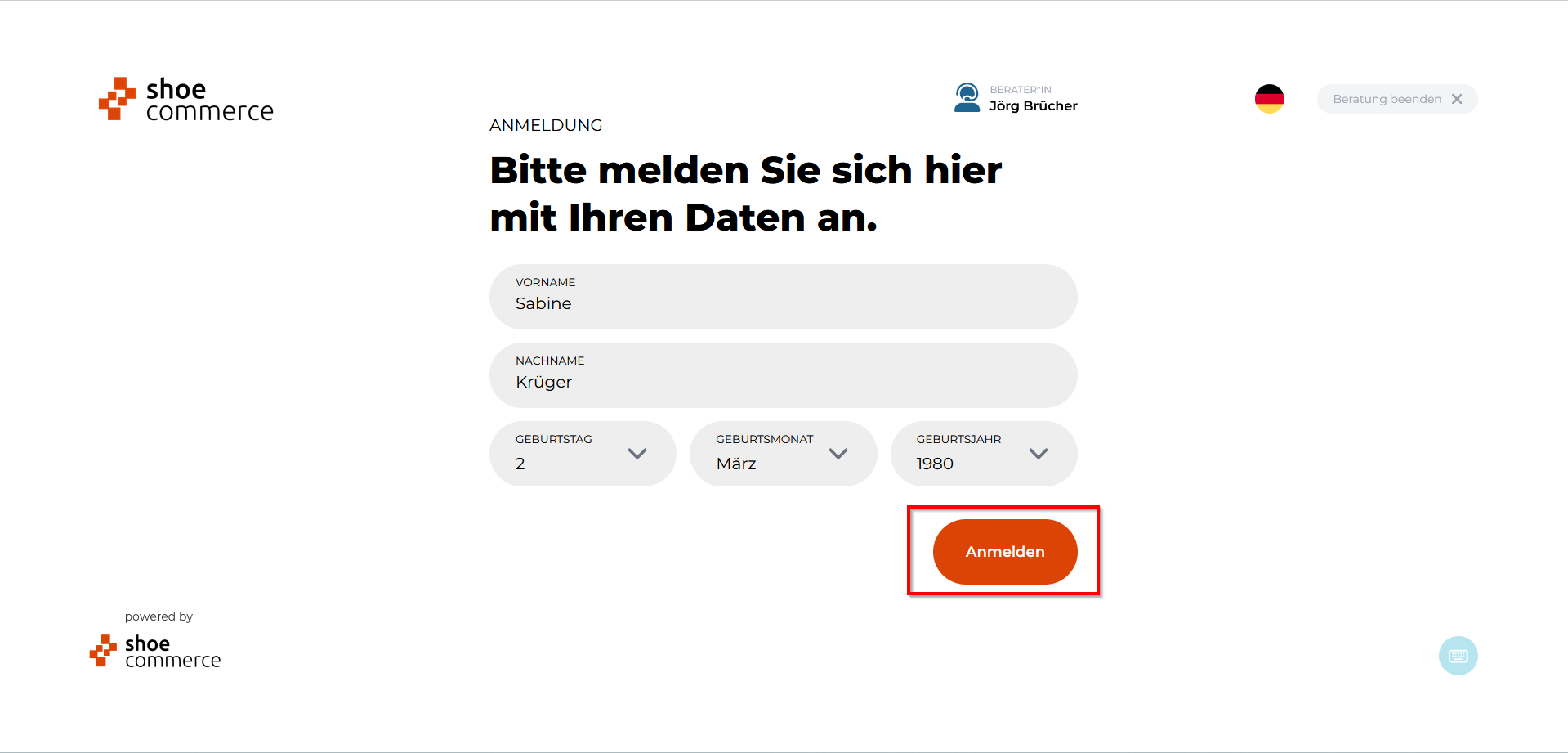 - Bitte geben Sie zunächst Vorname, Name und das Geburtsdatum des neuen Kunden/der neuen Kundin ein und klicken auf "Anmelden".