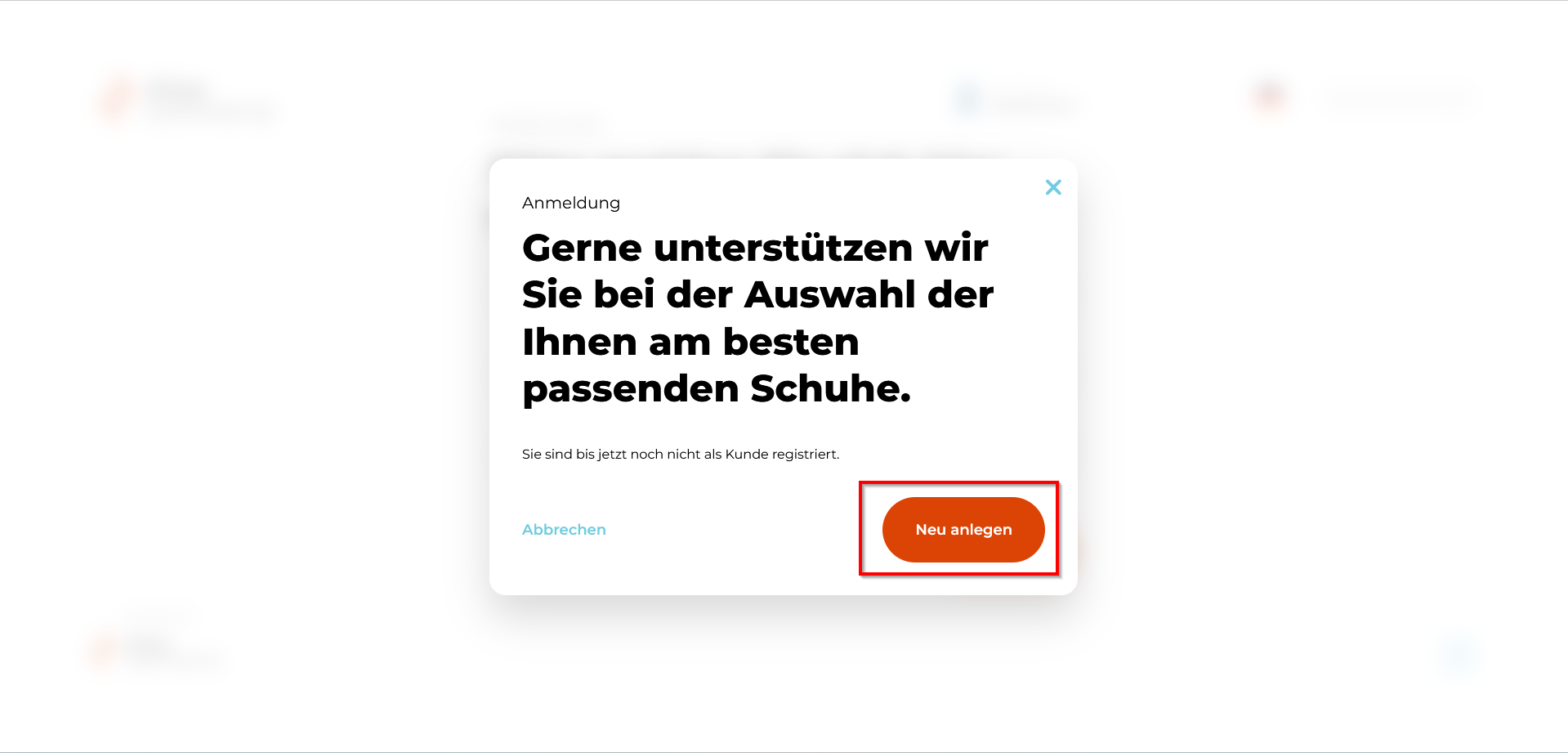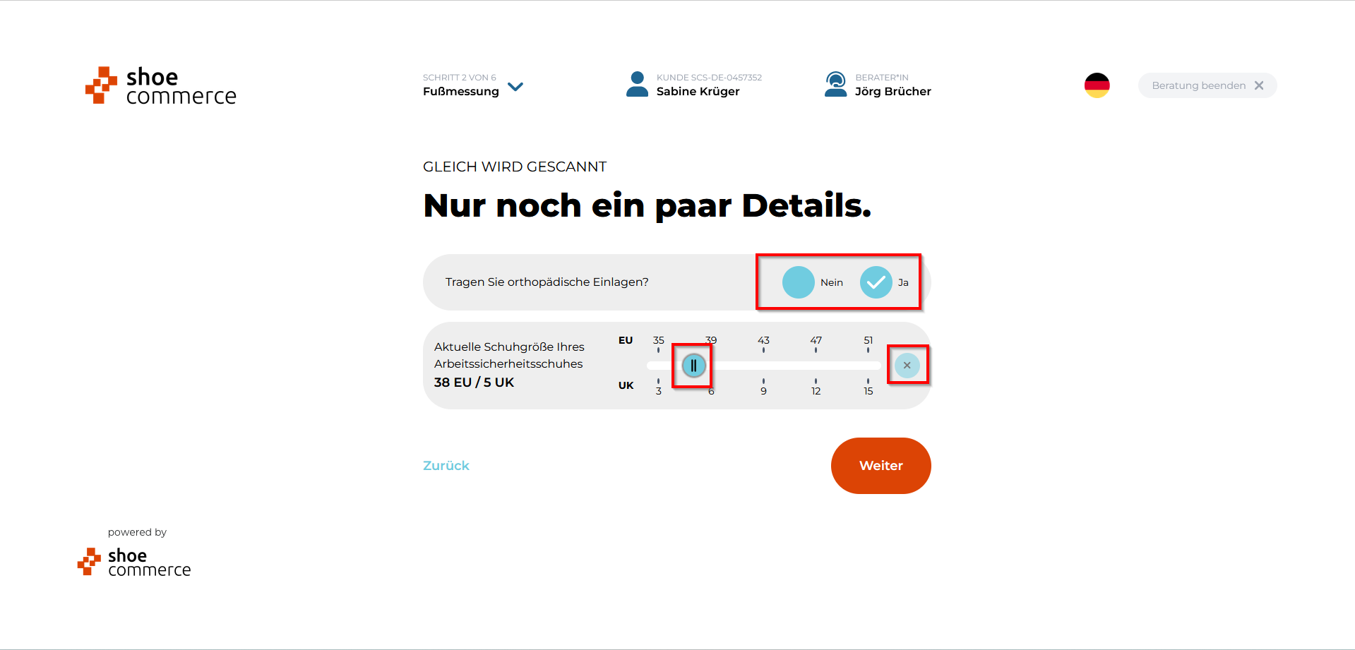 Mit Klick auf den Button "Weiter" ist die Eingabe der Grunddaten des neuen Kunden/der neuen Kundin beendet. Im nächsten Schritt erfolgt nun die Fußmessung.