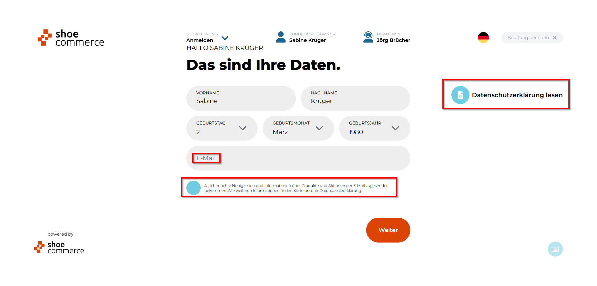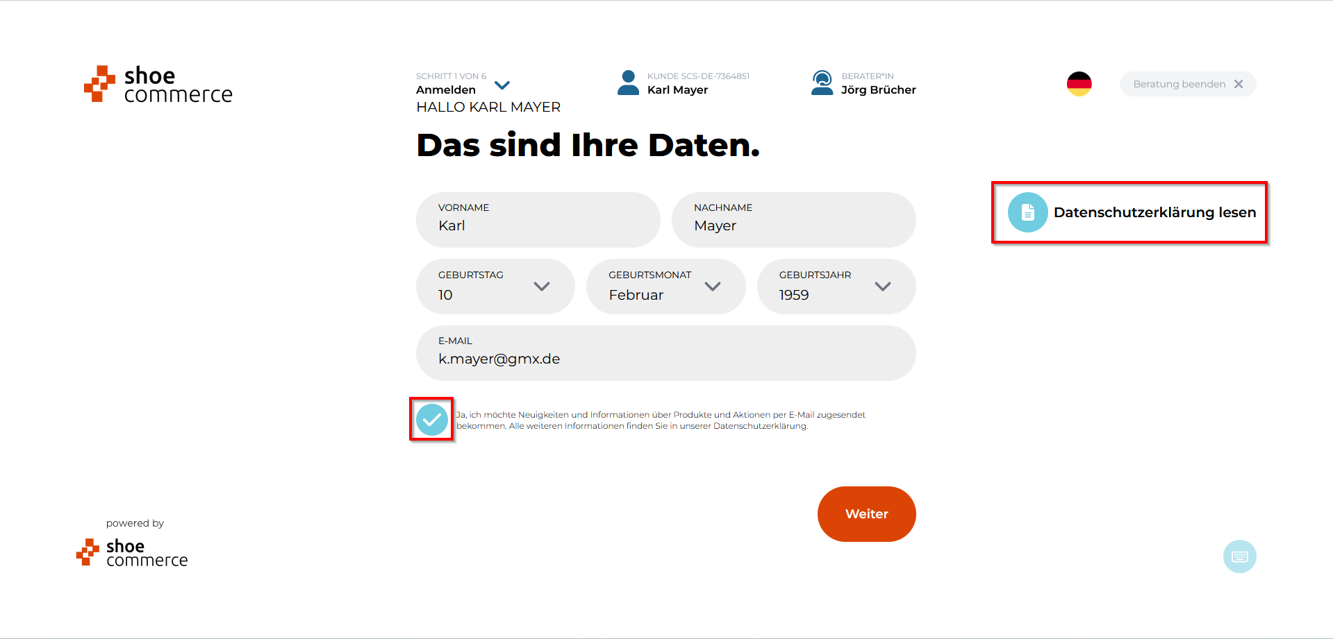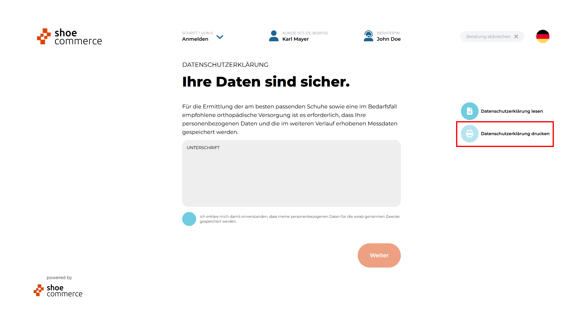 - Im nächsten Schritt wird die bereits unterschriebene Datenschutzerklärung des Kunden bzw. der Kundin angezeigt. Bitte Klicken Sie auf "weiter".