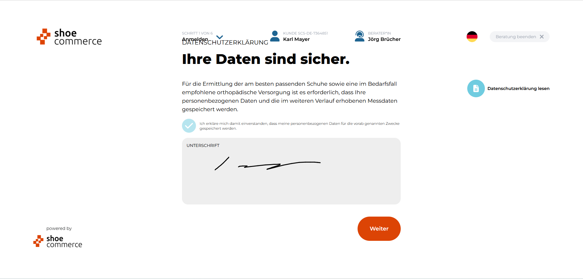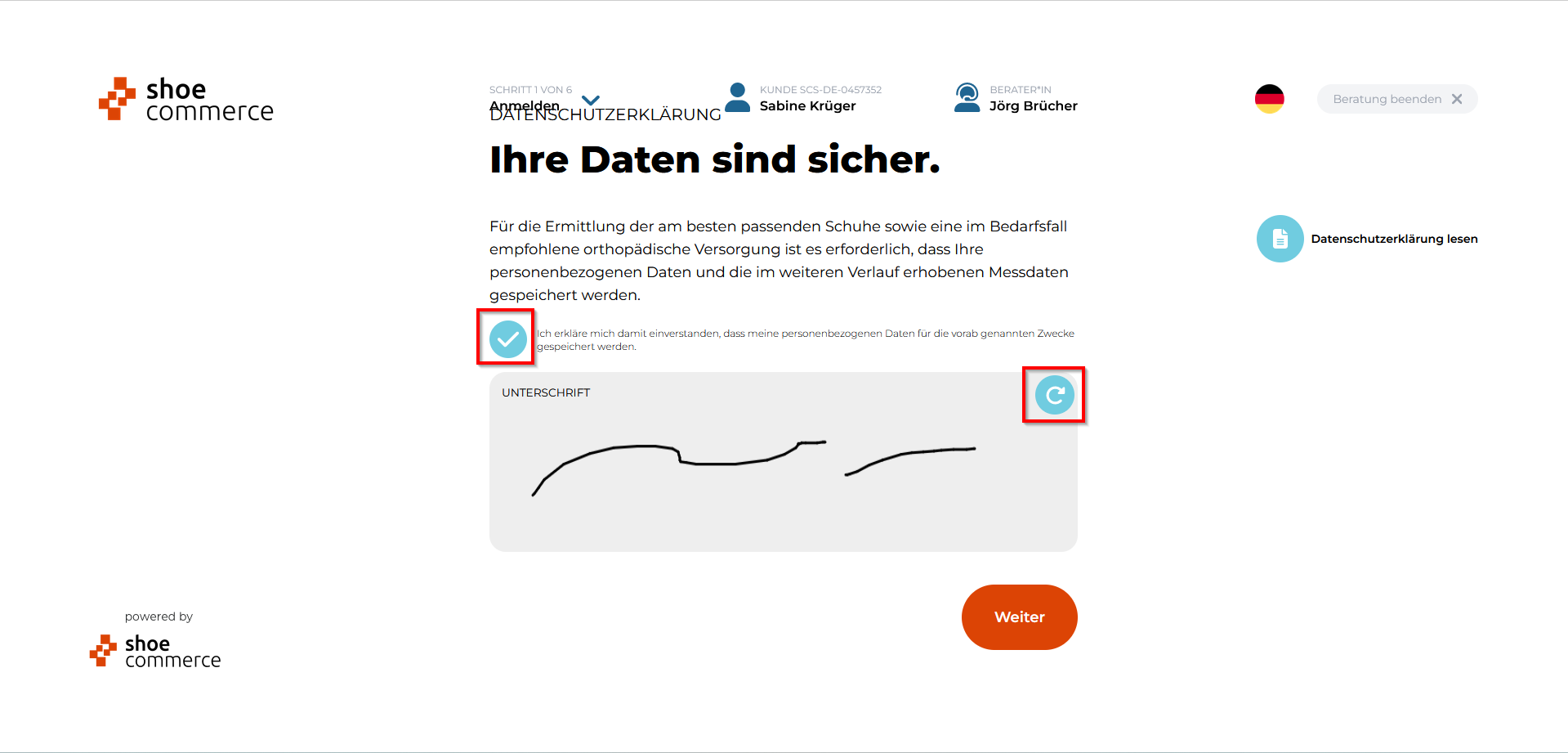 - Für die Ermittlung der am besten passenden Schuhe ist es erforderlich, dass die personenbezogenen Daten des Kunden/der Kundin im System gespeichert werden. Die Bestätigung hierzu erfolgt durch Klick in den blauen Kreis und Unterschrift in das grau hinterlegte Feld. Mit Klick auf den Wiederholen-Button oben rechts im grauen Feld wird die Unterschrift gelöscht und kann erneut durchgeführt werden. Auch in diesem Schitt ist es möglich die Datenschutzerklärung zu lesen. Im Anschluss klicken Sie bitte auf "Weiter".