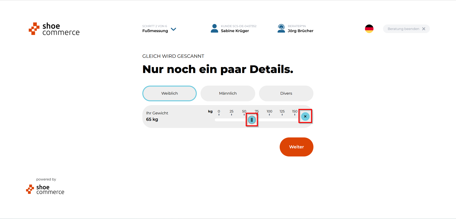 - Im nächsten Schritt erfolt die Eingabe sowohl des Geschlechts als auch des Gewichts des Kunden bzw. der Kundin. Letztgenanntes kann anhand des Schiebereglers durch Ziehen nach links und rechts verändert werden bzw. durch Klick auf den mit "x" markierten Button auf "Keine Angabe" zurückgesetzt werden. Sind alle Daten korrekt diese bitte mit Klick auf "Weiter" bestätigen.