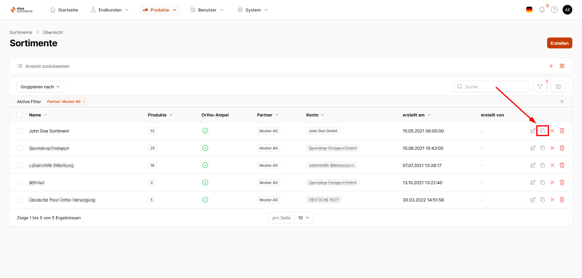 - Klicken Sie zunächst auf das Symbol "Duplizieren" für das Sortiment, das Sie als Grundlage verwenden möchten.