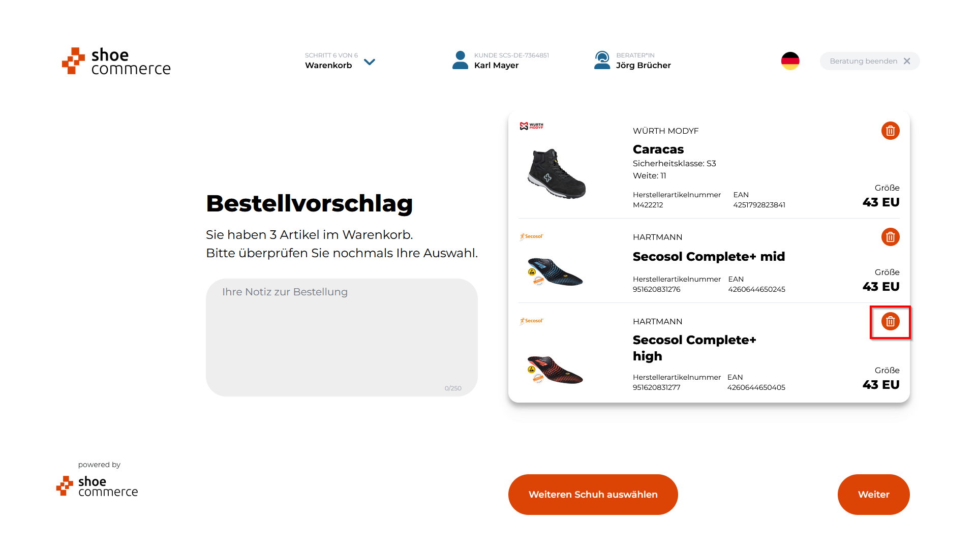 - Nachdem Sie in der Übersichtsseite der Ortho-Ampel auf "Weiter" geklickt haben, werden Sie zum Warenkorb weitergeleitet. Dieser enthält nun das gewählte Schuhmodell, bzw. alle weiteren ausgewählten Schuhmodelle, inklusive der dazugehörigen Fußbettungen. Mit Klick auf das Mülleimer-Symbol haben Sie hier die Möglichkeit einzelne Artikel aus dem Warenkorb zu entfernen (siehe unten). Mit Klick auf "Weiteren Schuh auswählen" gelangen Sie auf die Übersichtsseite der Schuhauswahl zurück. Ihre bisherigen in den Warenkorb gelegten Artikel bleiben dabei erhalten.