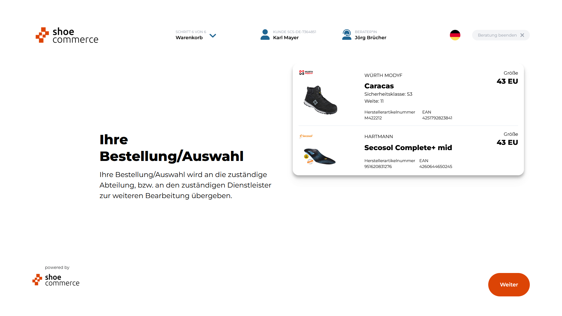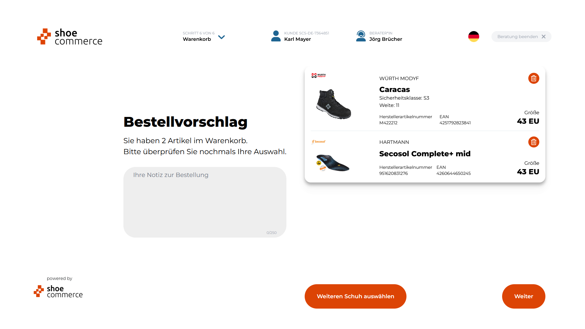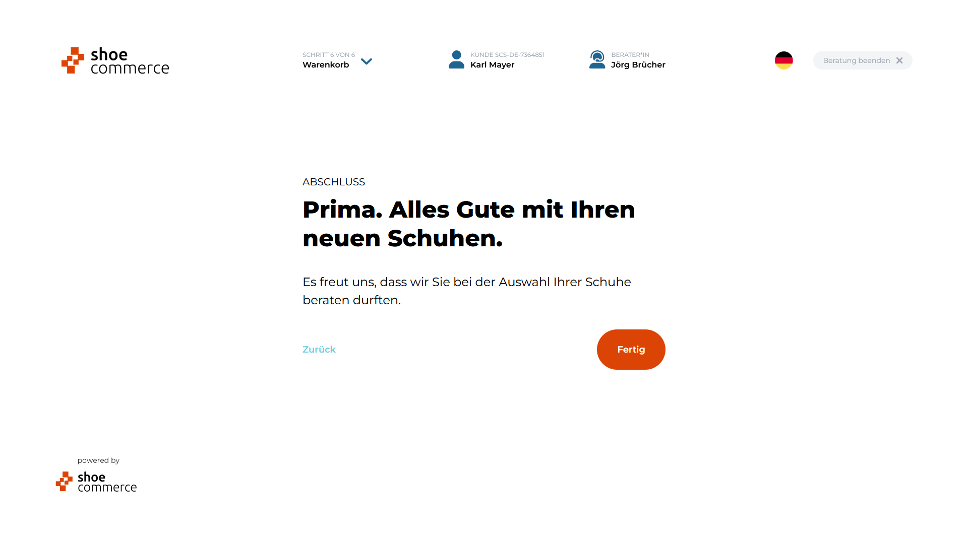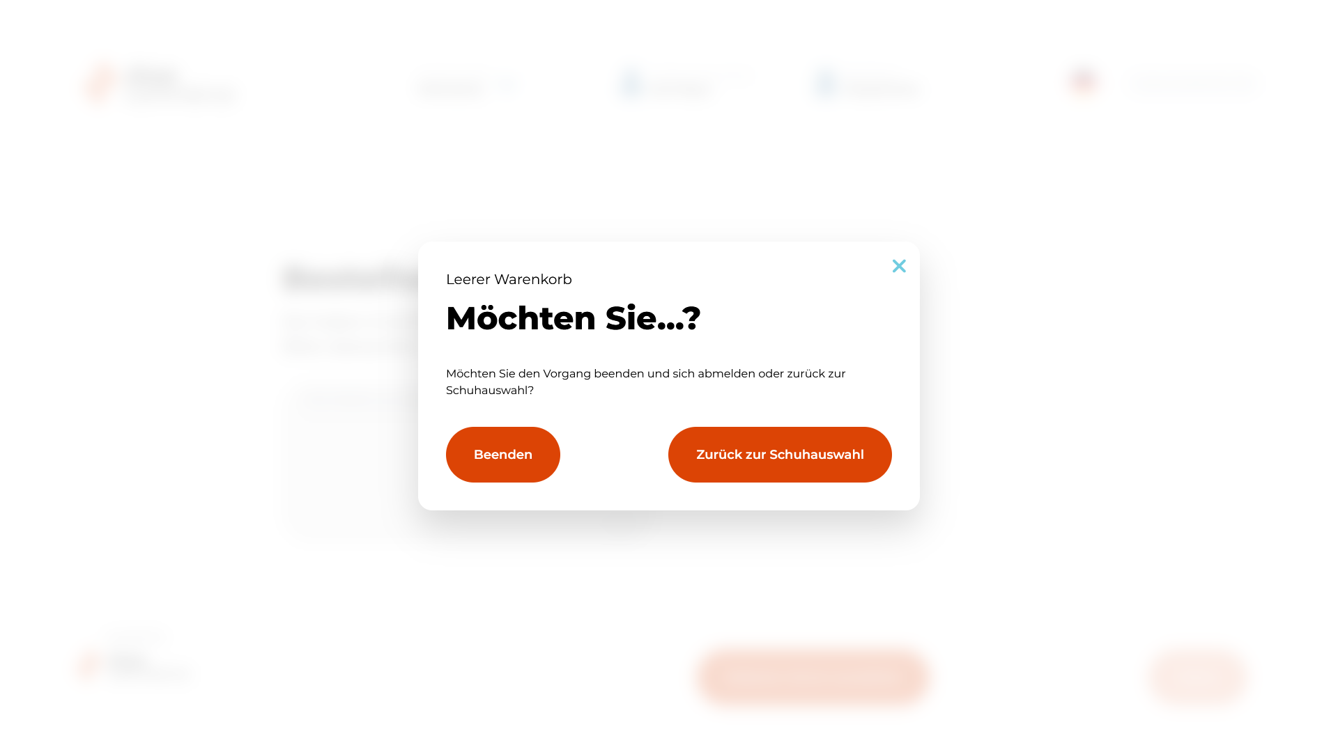 Spezialfall: Entfernen Sie den letzten im Warenkorb befindlichen Artikel durch Klick auf das Mülleimer-Symbol erscheint die Abfrage, ob Sie den gesamten Vorgang entweder beenden, oder zurück zur Schuhauwahl geleitet werden möchten. Mit Klick auf "Beenden" wird die gesamte Beratung beendet und Sie gelangen zurück auf die Startseite des Systems. Mit Klick auf "Zurück zur Schuhauswahl" bleibt die aktuelle Beratungssizung jedoch aktiv und Sie können den Prozess der Schuhauswahl nochmals neu starten.
