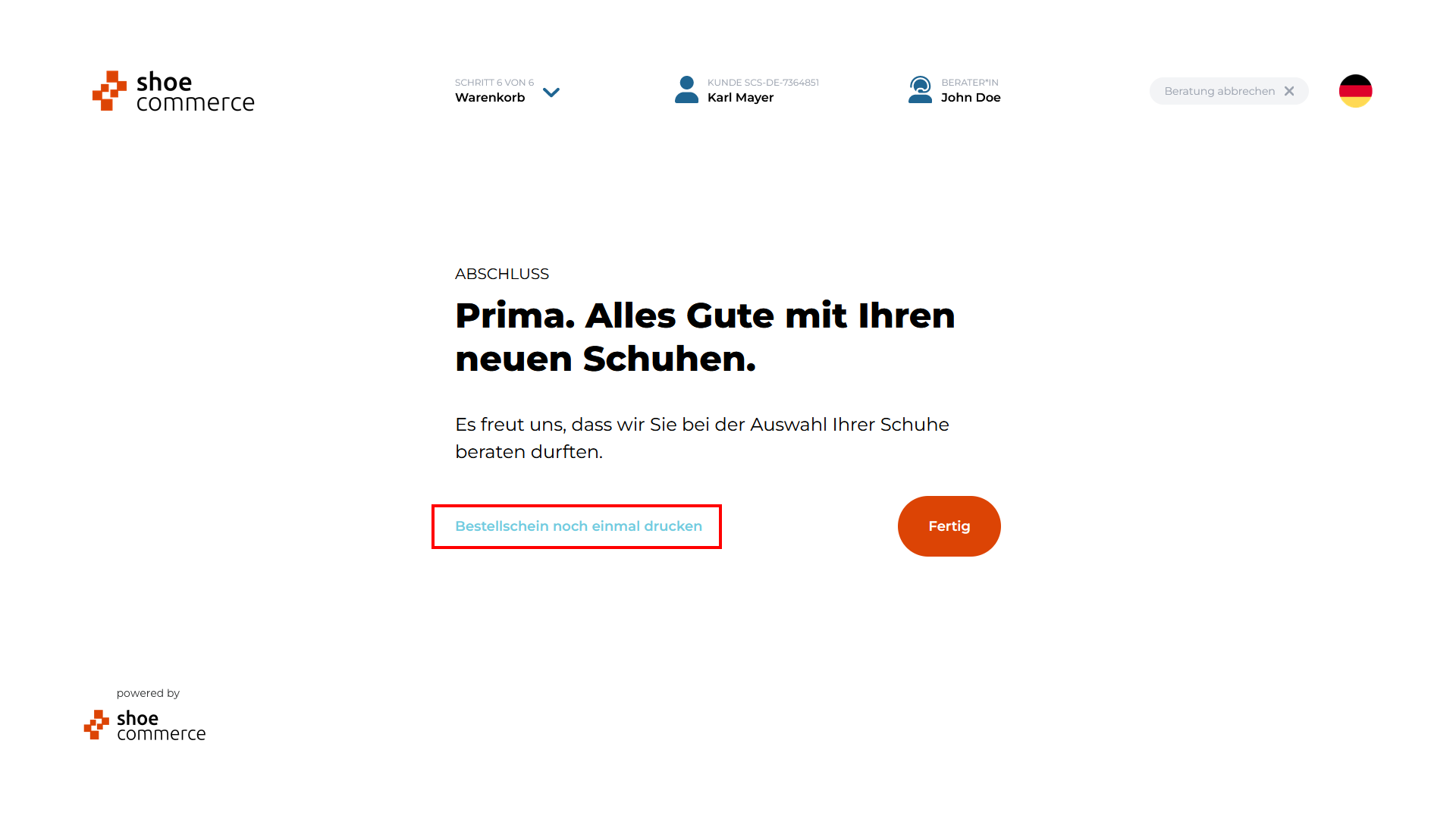 - Zum Abschluss haben Sie entweder die Möglichkeit sich die Bestellübersicht aus Punkt 5 durch Klick auf "Zurück" nochmals anzusehen, oder Sie gelangen mit Klick auf "Fertig" zurück auf die Startseite, um eine neue Beratung beginnen zu können.