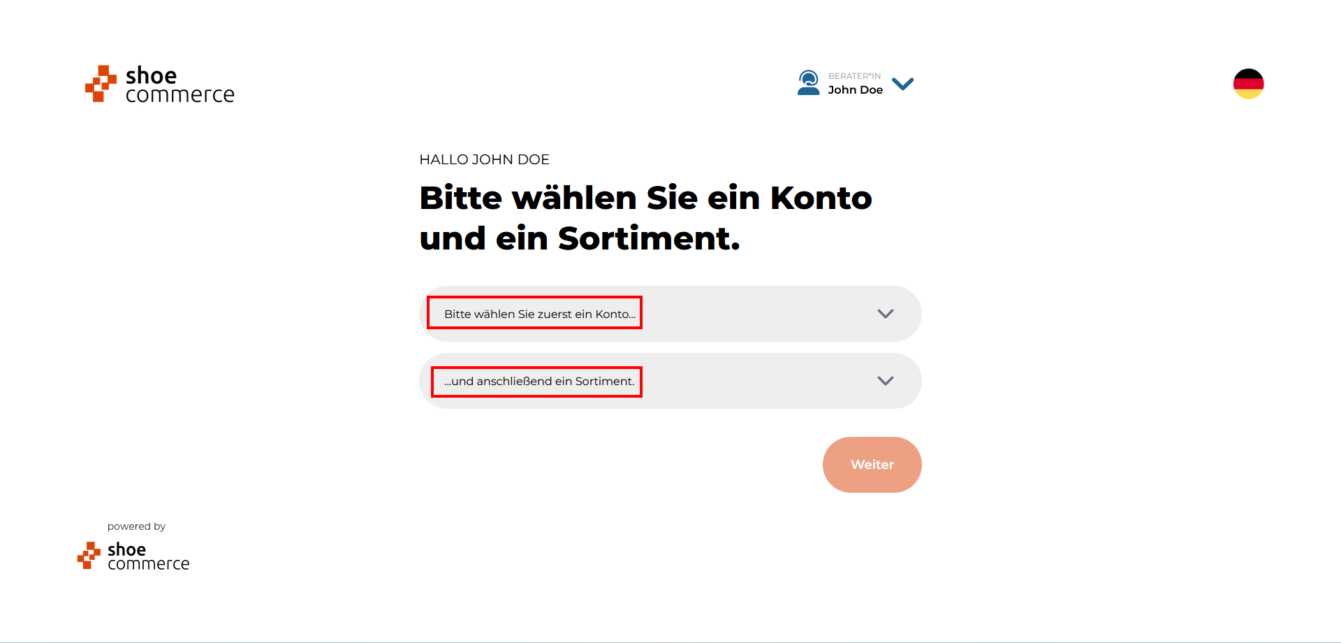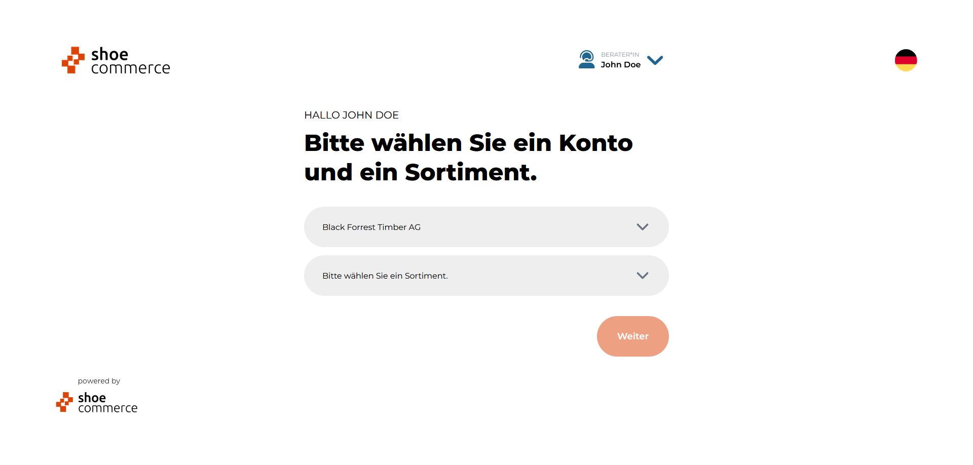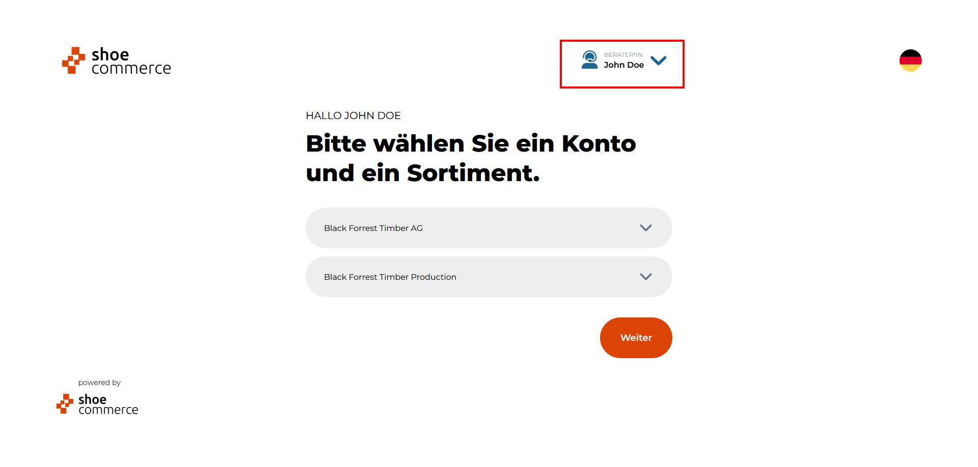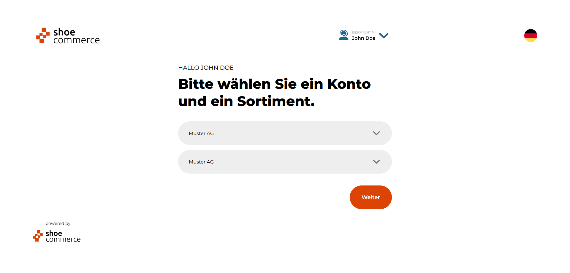 - Die verfügbaren Optionen zur Auswahl eines Kontos bzw. Sortiments können nun über die entsprechenden Dropdown-Menüs ausgewählt werden, hier im Beispiel die Muster AG. Bitte bestätigen Sie die Auswhal mit "Weiter".