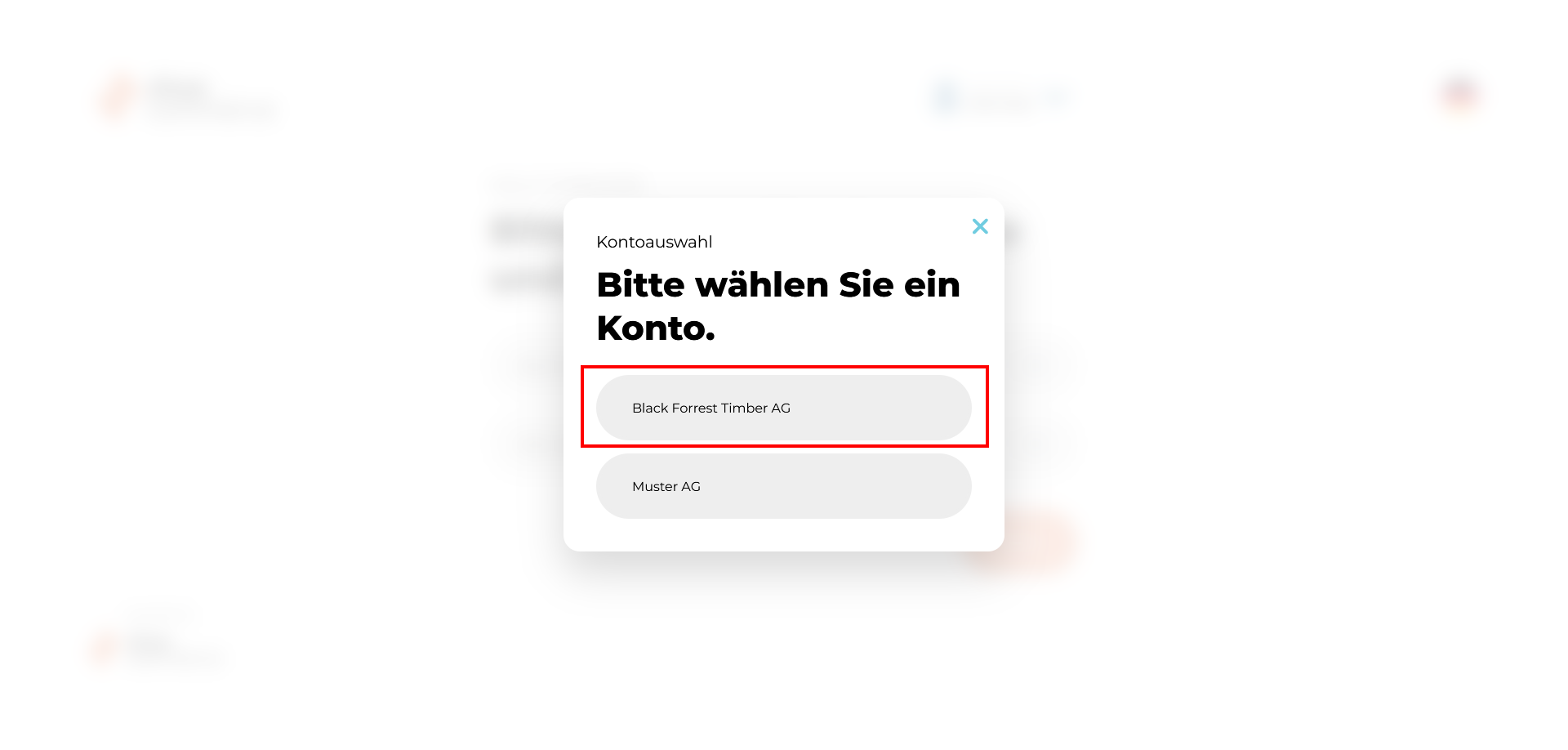 - Die Verfügbaren Optionen zur Auswahl eines Kontos werden nun angezeigt und können durch Klick ausgewählt werden. In unserem Fall wählen wir beispielhaft die "Black Forrest Timber AG", welche dann anschließend im Dropdown-Menü erscheint.