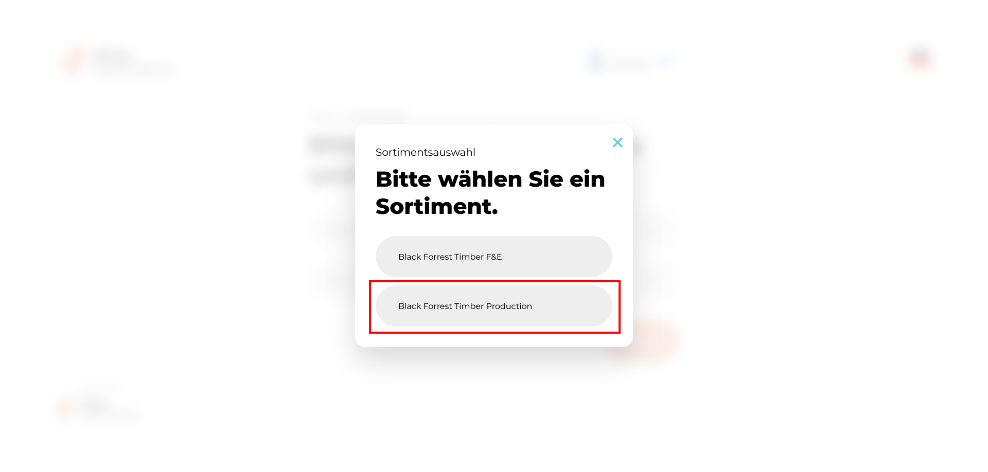 - Die Verfügbaren Optionen zur Auswahl eines Sortiments werden nun angezeigt und können durch Klick ausgewählt werden. In unserem Fall wählen wir beispielhaft das Sortiment "Black Forrest Timber Production", welches dann anschließend im Dropdown-Menü erscheint.
