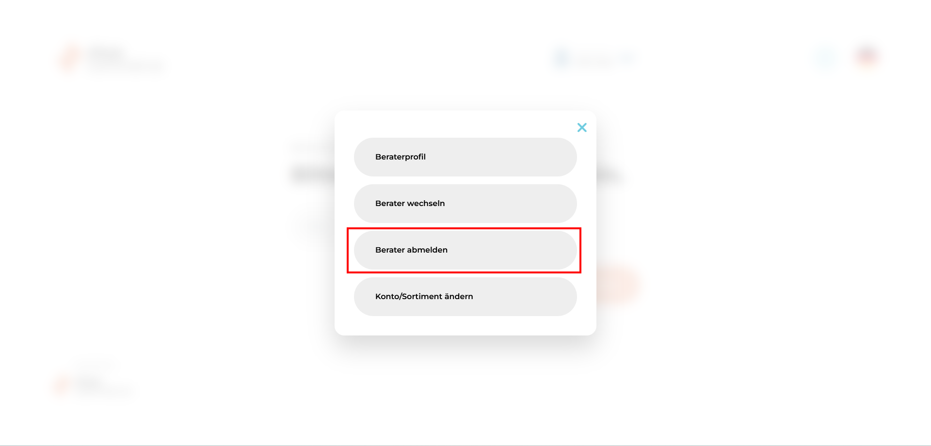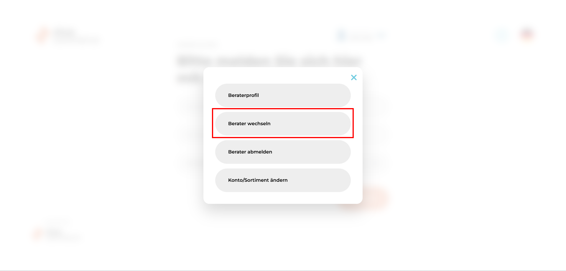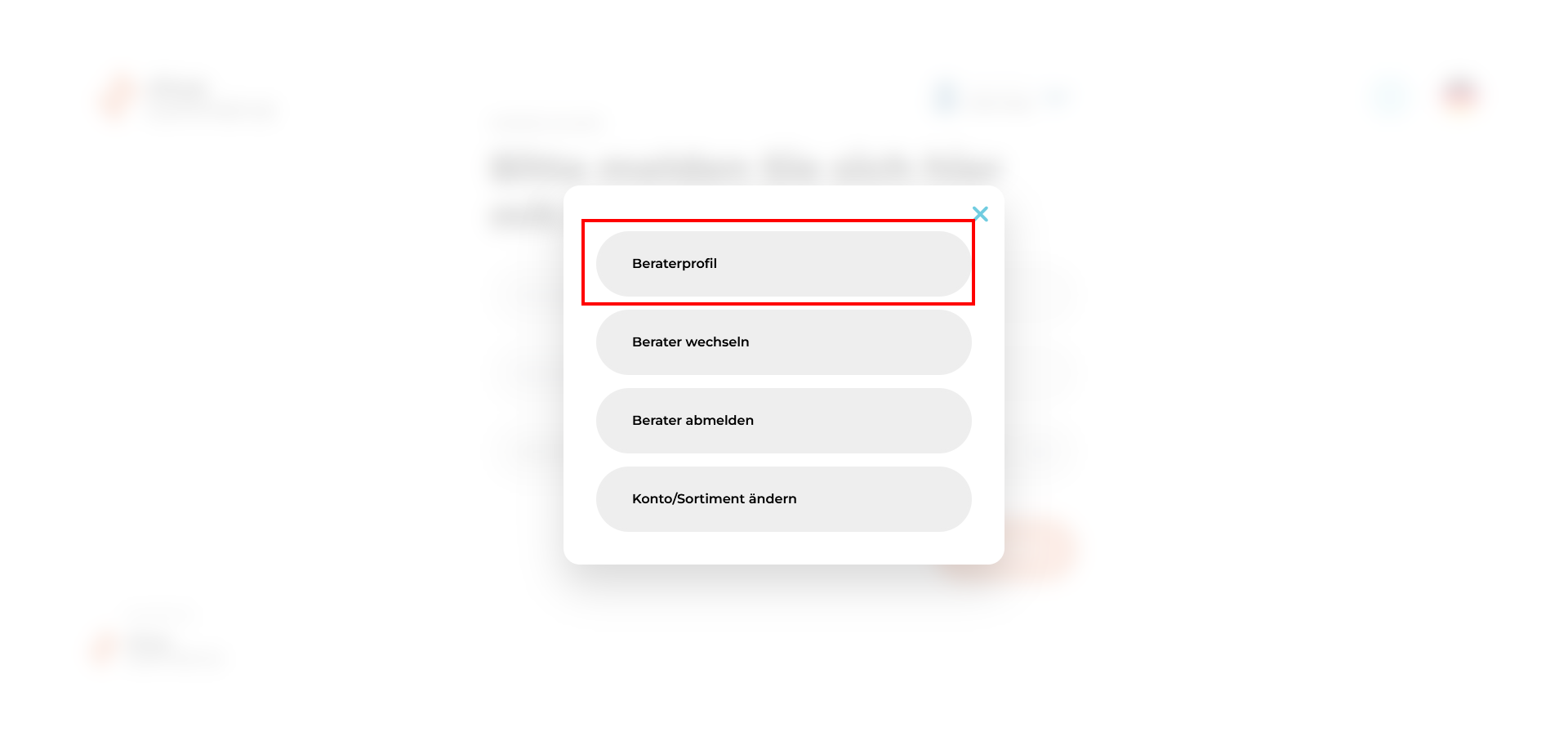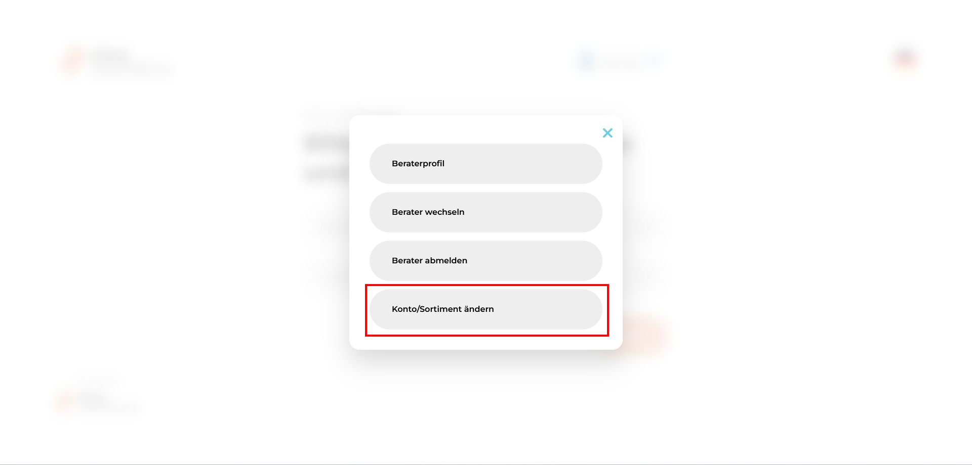 - Um das aktuell ausgwählte Konto und/oder das Sortiment zu ändern, klicken Sie bitte zunächst in der Beraterverwaltung auf das entsprechende Menü.
