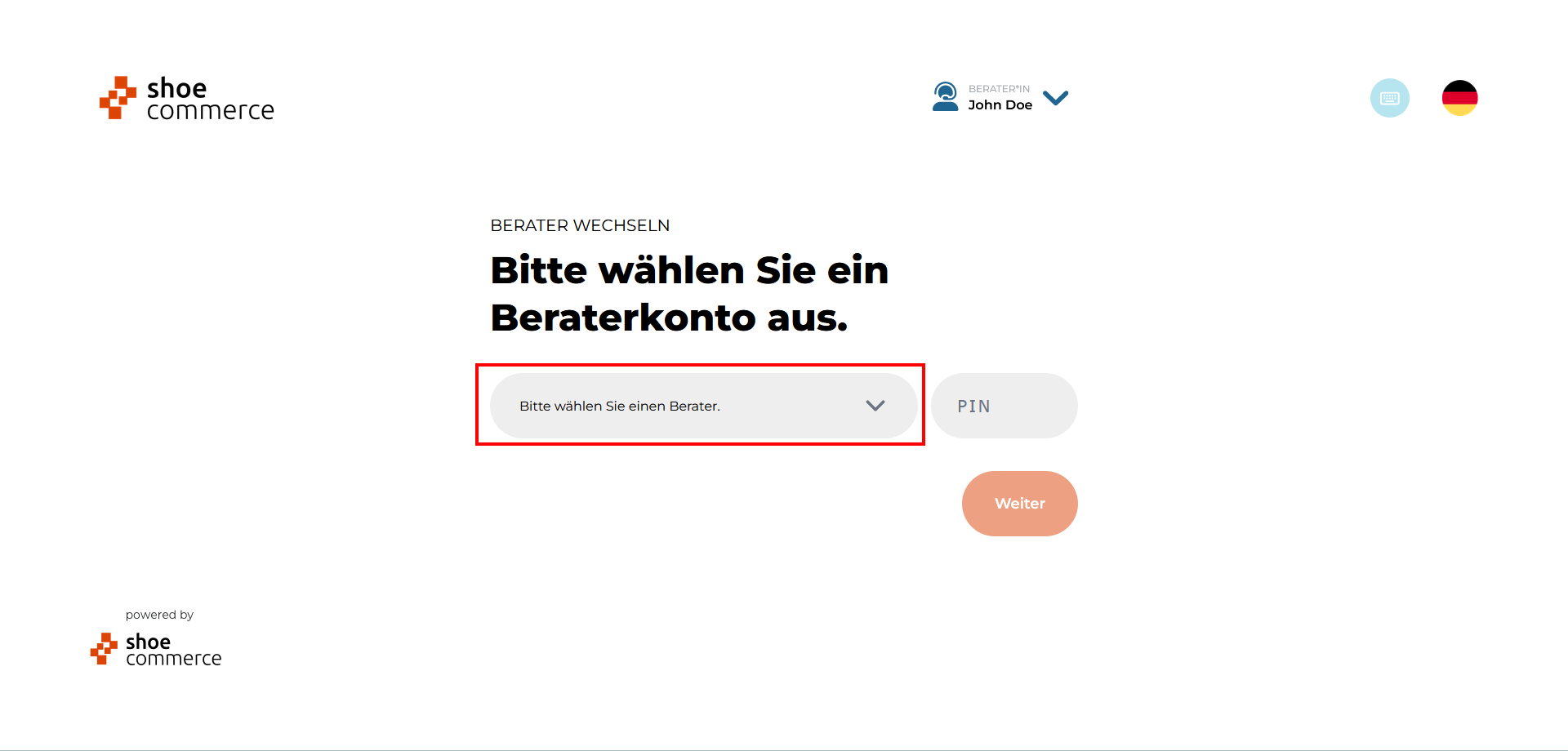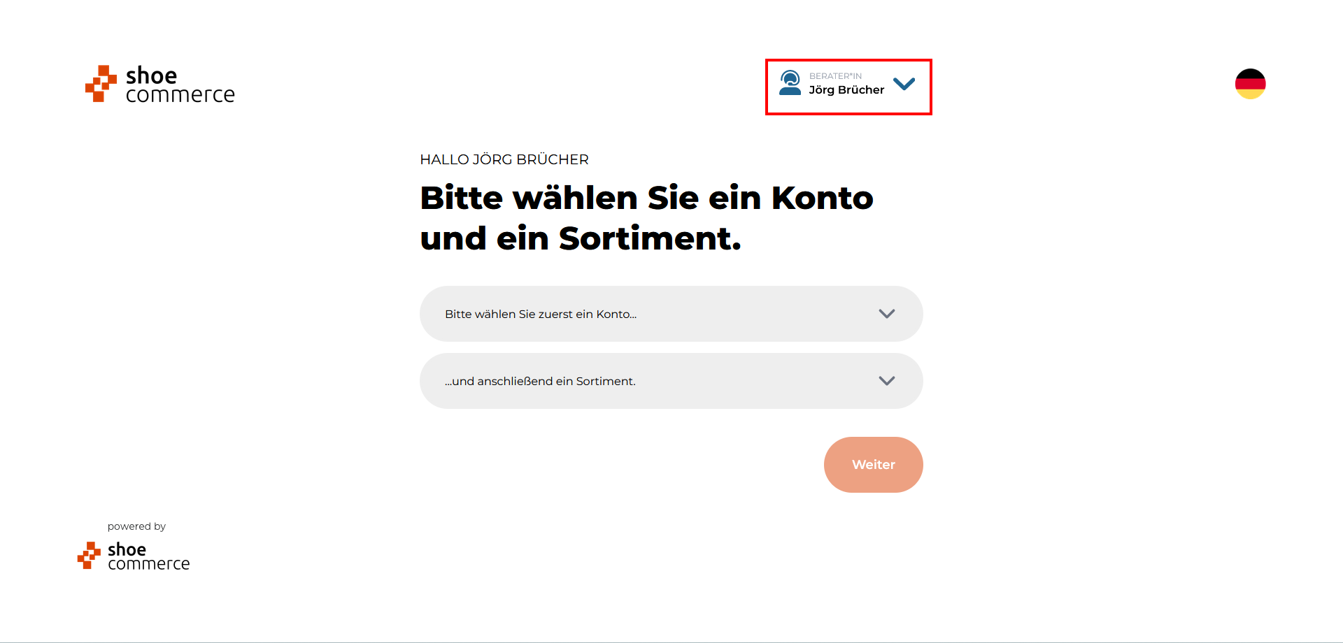 - Sie haben jetzt den Berater gewechselt und müssen im letzten Schritt noch das gewünschte Konto und Sortiment auswählen um darauf folgend neue Kunden und Kundinnen anmelden zu können.