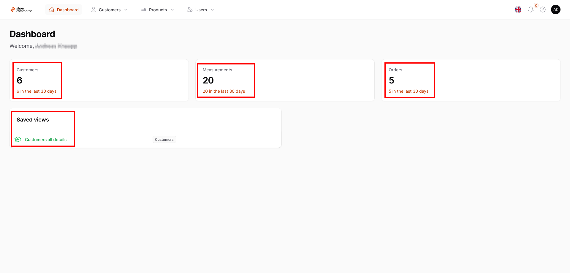 - Furthermore, you will be shown news from the last 30 days in the “Customers”, “Measurements” and “Orders” segments. In addition, you can access all the views you have saved and marked as favorites directly from the dashboard. Here in the example “Customers all details”. You can find out how to create these views here.