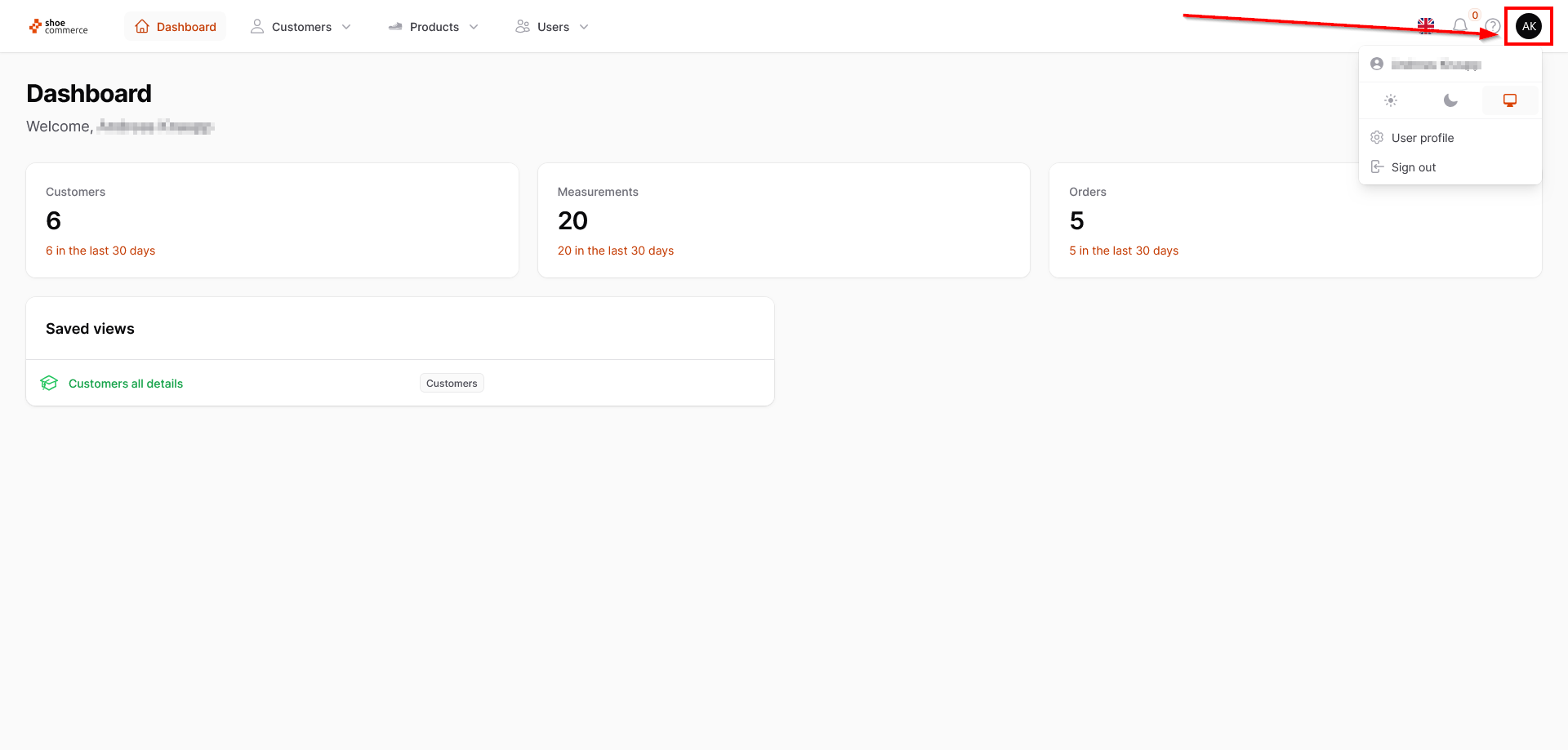 - You can access the user profile of the dashboard by clicking on your initials in the top right-hand area of the dashboard. Here you have the option of switching the display to a dark mode or using the system theme of your operating system.