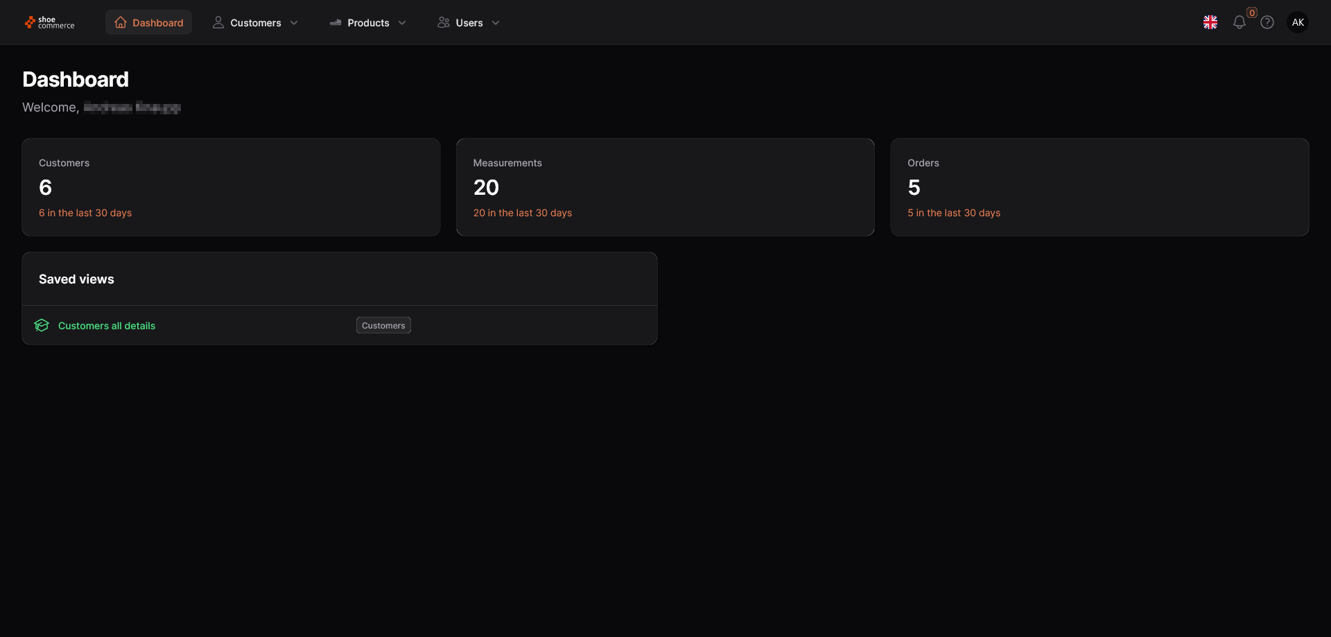 - After signing in to the backend, you will be taken to the dashboard. This is the start screen of the MyPSA backend. You can return to the dashboard at any time by clicking on the “shoe commerce” logo or on the “Dashboard” button.