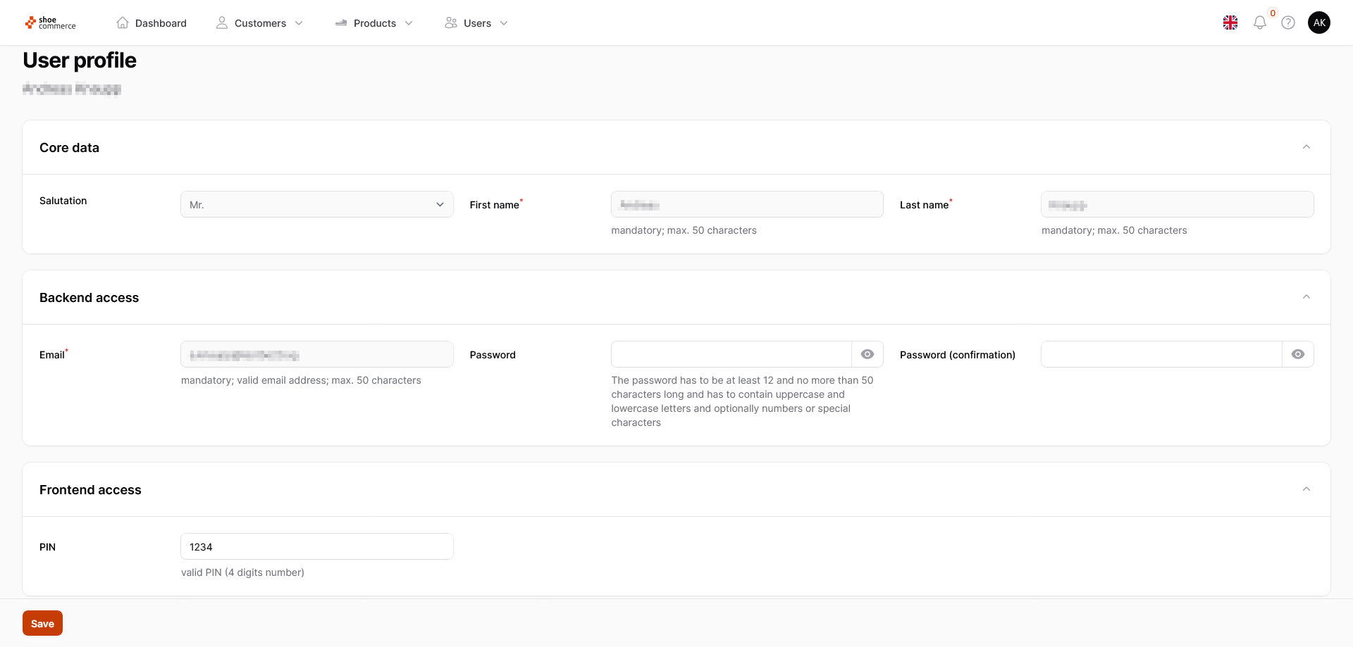 - You can also change not only your Backend and Frontend password but also your e-mail address by clicking on "User profile". If you change your password, first enter it in the “Password” field and repeat the entry in the “Password (confirmation)” field. Then click on “Save” to be able to use your new password or your new e-mail address.